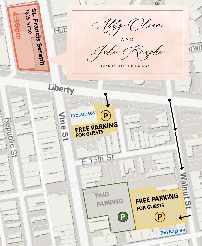 St. Francis Seraph 1615 Vine Street Cincinnati, OH 45202Transportation will be provided for all hotel guests to and from the wedding day events. Shuttle departs from the hotel promptly at 3:45pm. If you plan to drive, please see the map below for additional parking options.